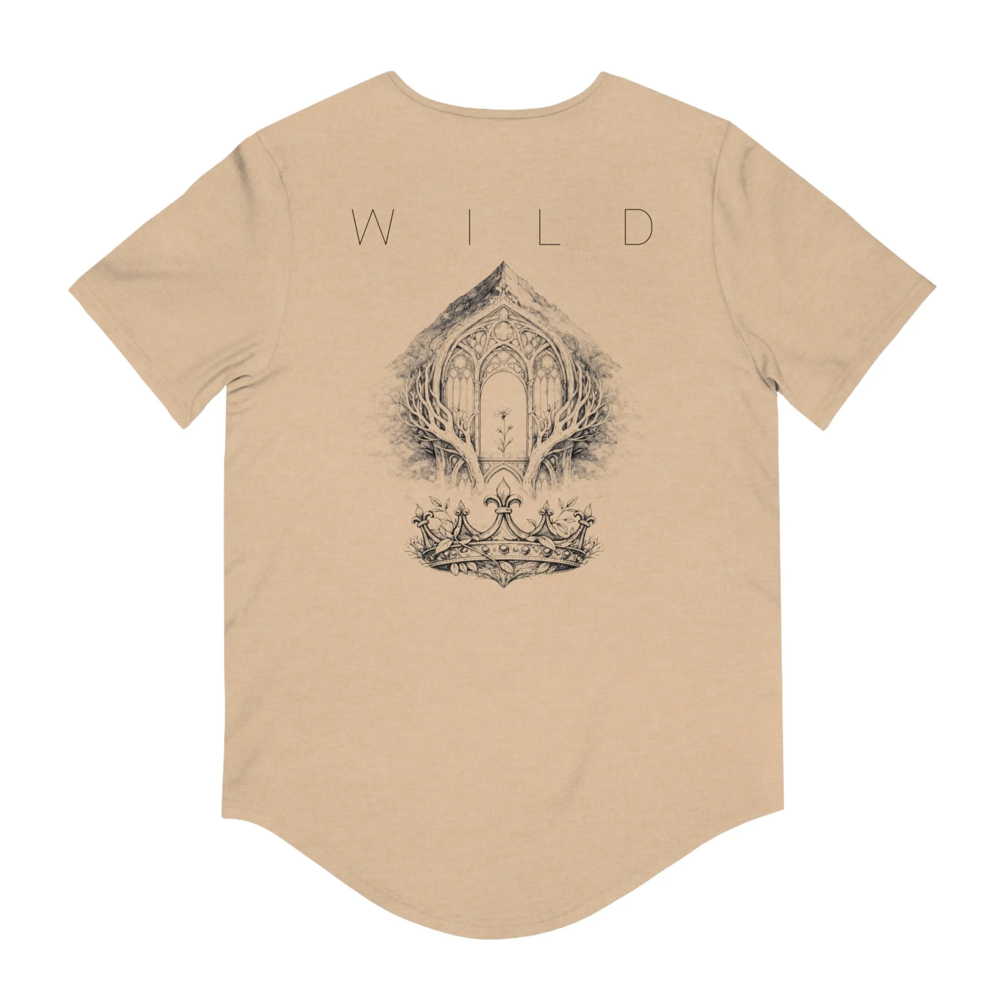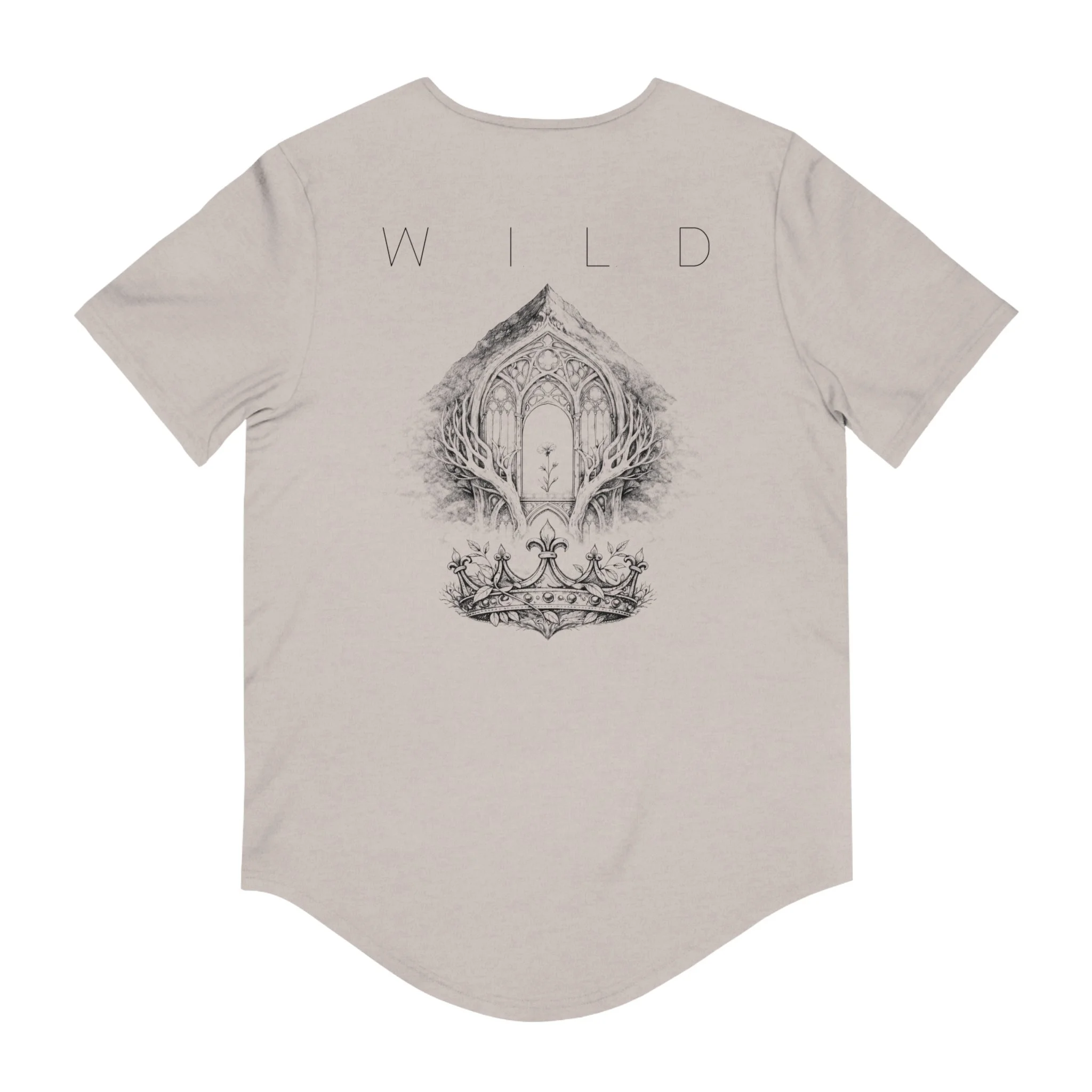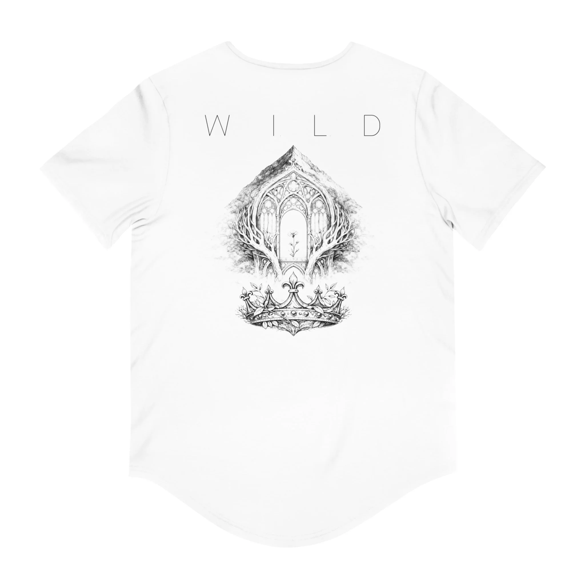 Lightweight and thoughtfully shaped, this curved-hem tee carries a quiet, atmospheric vibe. The soft airlume combed cotton feels cool against the skin while the fitted retail cut and side seams keep the silhouette clean. A subtle emblem on the chest and a hand-drawn, cathedral-like illustration on the back—framed by the word WILD—give the shirt a poetic, slightly mysterious feel. Wear it on slow mornings, long drives, or layered under a jacket for evenings when you want something understated but evocative. It moves with you, holds its print, and reads like a small statement: calm, curious, and a little untamed.